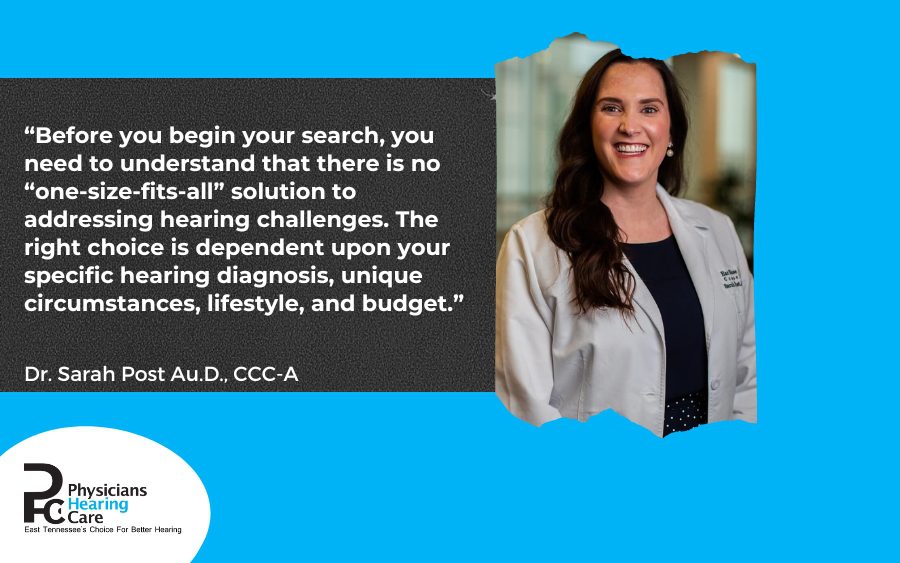 Before you begin your search, you need to understand that there is no “one-size-fits-all” solution to addressing hearing challenges. The right choice is dependent upon your specific hearing diagnosis, unique circumstances, lifestyle, and budget.